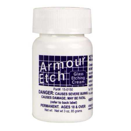 Armour Etch es un compuesto para grabado en vidrio, especialmente formulado de acción rápida que le permite crear diseños grabados de forma permanente en ventanas, espejos y cristalería doméstica como vasos, tazas de vidrio, reconocimientos en vidrio o cualquier otro articulo.